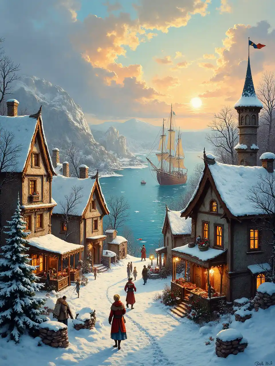 Jonathan안톤 피크(Anton Pieck) 스타일에서 영감을 받은 유화(겨울의 중세 판타지), 복잡한 파사드가 있는 매력적인 주택, 눈으로 덮인 지붕, 활기찬 인물들로 붐비는 시장, 얼음 속 보트의 해안, 따뜻한 햇살이 부드러운 겨울 구름을 뚫고 고요하고 마법 같은 분위기를 연출합니다.(활기찬 색상) 매혹적이고 향수를 불러일으키는 장면을 위해.