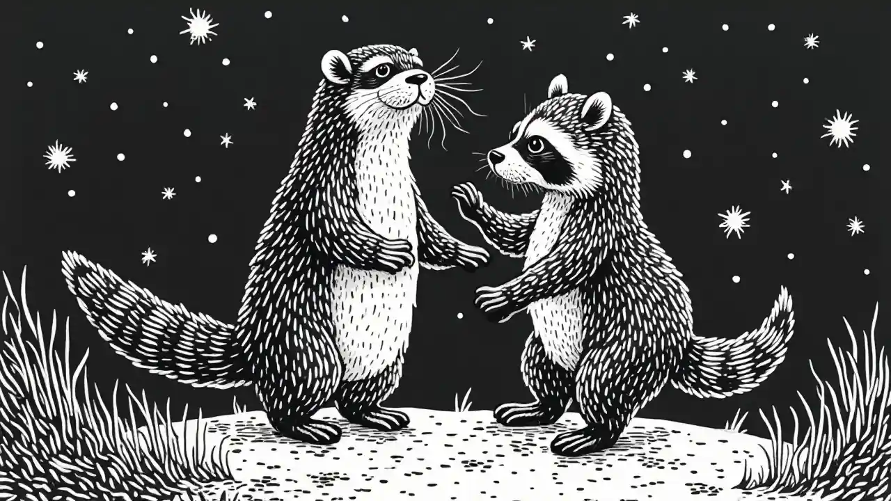 반짝이는 별빛 먼지 사이 달에서 즐겁게 춤추는 털수달과 너구리의 흑백 목판화