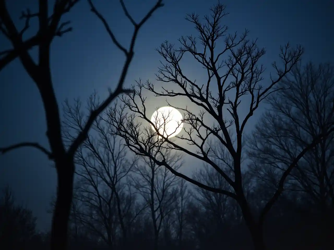 ( ( ( 墨式 ) ) ) 보름달, 마른 가지가 덮는다.밤하늘 맑음