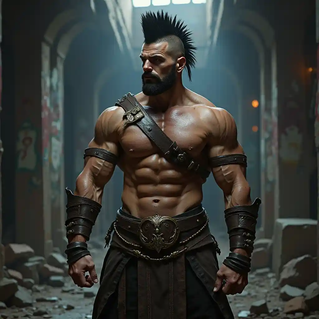 판타지 리얼리즘 근육질 남성 바바리안 678ee8ef 검은 모호크와 가죽끈, 화려한 허리띠를 가진 근육질 몸매 조명이 희미한 지하 경기장에서 당당하게 서 있는 이 근육질 몸매는 자신의 이두근과 몸통을 감싸는 복잡한 가죽끈으로 장식된 장엄한 몸매를 보여준다.그의 허리에 있는 반짝이는 화려한 벨트는 부드럽고 반짝이는 조명 아래에서 반짝이며 그의 명확한 체격을 강조합니다.낙서로 덮인 벽과 흩어져있는 파편의 배경은 그의 사나운 검은 Mohawk와 극명하게 대조되어 역동적 인 카메라 각도가 모든 매력적인 각도에서 그를 포착하기 때문에 그가 여전히 장면의 부인할 수없는 초점임을 확인합니다.