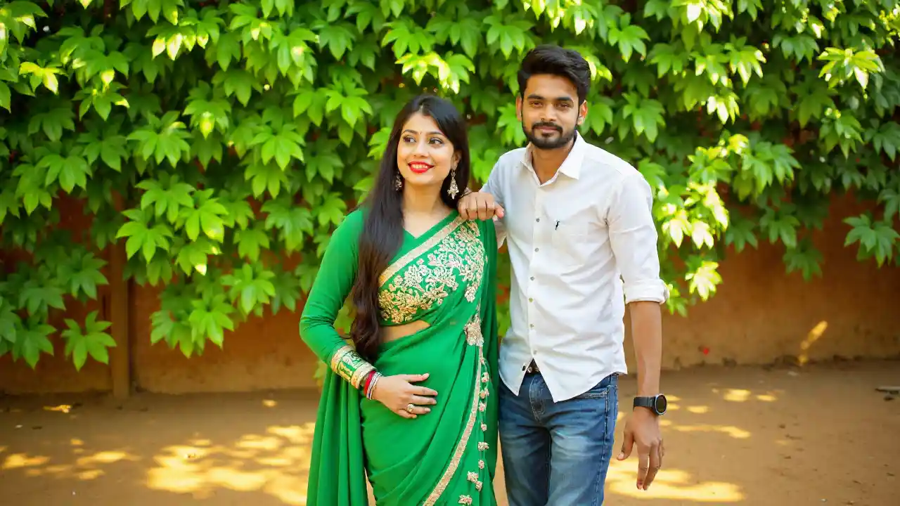 따스한 햇살을 받으며 활기찬 푸른 잎사귀를 배경으로 서 있는 한 커플은 그림 같은 야외 풍경을 연출합니다.여성은 복잡한 금색 자수로 장식된 우아한 녹색 사리를 입고 등을 따라 내려오는 긴 머리와 자신감 넘치는 포즈와 미묘한 미소를 지으며 밝은 붉은 립스틱을 강조했습니다.그녀의 옆에는 상쾌한 흰색 셔츠와 파란색 청바지를 입고 한 손으로 엉덩이를 잡고 서 있는 남자가 캐주얼한 매력을 발산했다.그들의 표정은 기쁨과 화합의 감각을 반영하며, 땅의 흙빛 톤과 뒤에 질감이 있는 벽은 자연 환경에서 편안한 하루를 보내는 것을 암시하는 표정을 강화합니다.