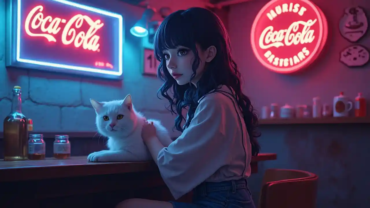 흰 고양이와 함께 술집에 앉아 있는 일본 여성, 벽의 코카콜라 간판, 파란색과 분홍색 네온사인