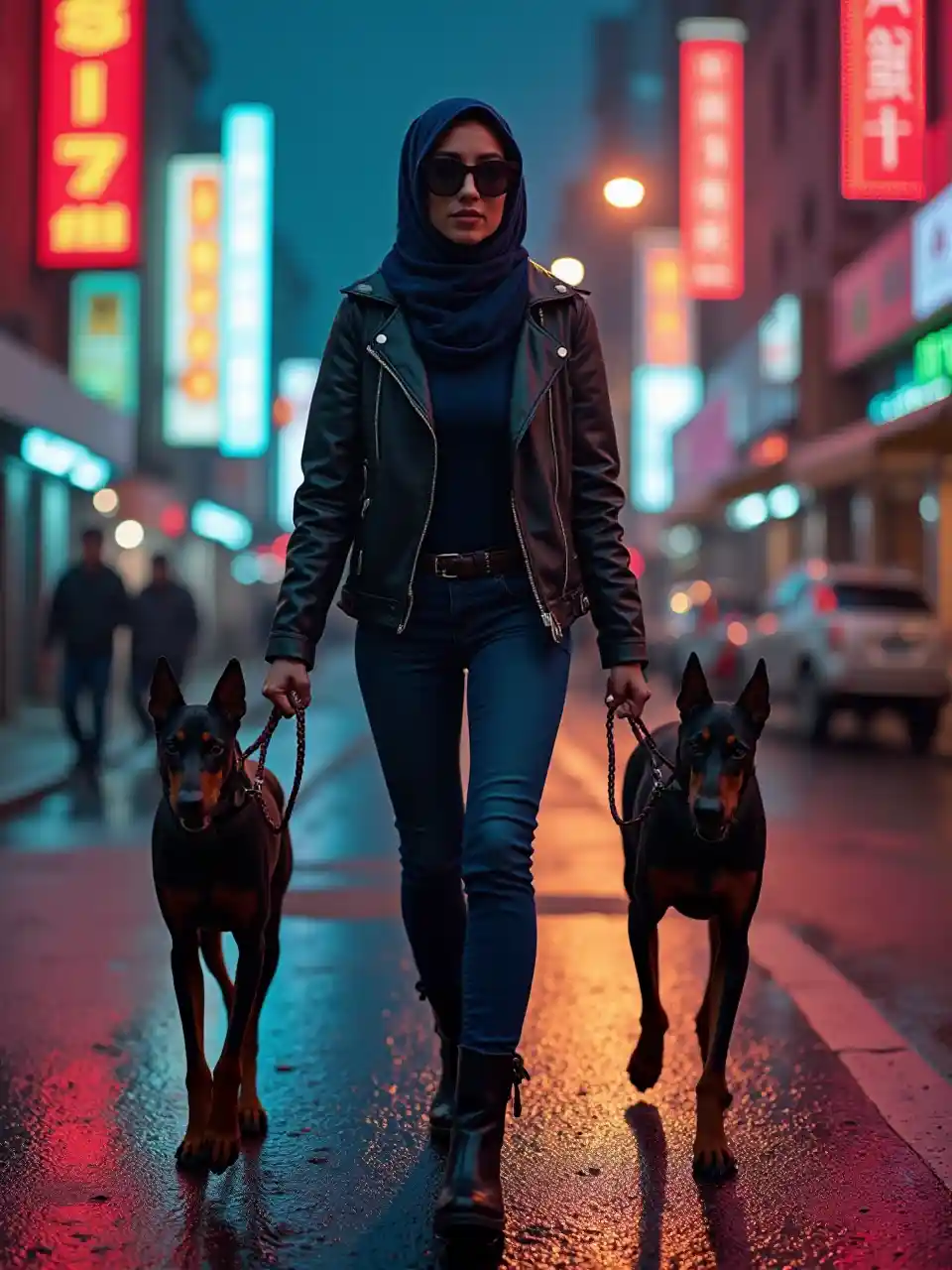"검은색 가죽 재킷, 남색 터번, 검은색 선글라스, 핏빛 청바지, 부츠를 입은 중동의 유력 여성이 밤에 네온사인이 비추는 젖은 도시 거리를 자신 있게 걸어가는 JOJOV2 영화의 슬로우 모션 영상.그녀는 두 마리의 튼튼한 검은색 도베르만을 끌고 짧은 가죽 끈을 매고 그녀와 보조를 맞췄습니다.장면은 저각도이며 비가 오는 도로에는 네온사인 표지판과 지나가는 헤드라이트가 반사되어 있습니다.그녀의 표정은 차분하고 차분하며 자신감이 넘쳤다.이 개들은 경계를 늦추지 않고 그녀의 다리에 가까이 다가갔습니다.카메라는 뒤에서 앞으로 부드럽게 미끄러져 그녀가 걷는 동안 천천히 상승했습니다.그녀의 발걸음 소리가 부드럽게 울려 퍼졌다.가로등이 희미하게 깜박이고 부드러운 안개가 배경을 이동하며 미묘한 베이스 펄스와 함께 영화 같은 음악이 재생됩니다.85mm 렌즈 형태로 촬영, 버터 액션, 사실적인 피부 질감, 부드러운 조명.초현실적이거나 인위적인 요소는 없습니다."