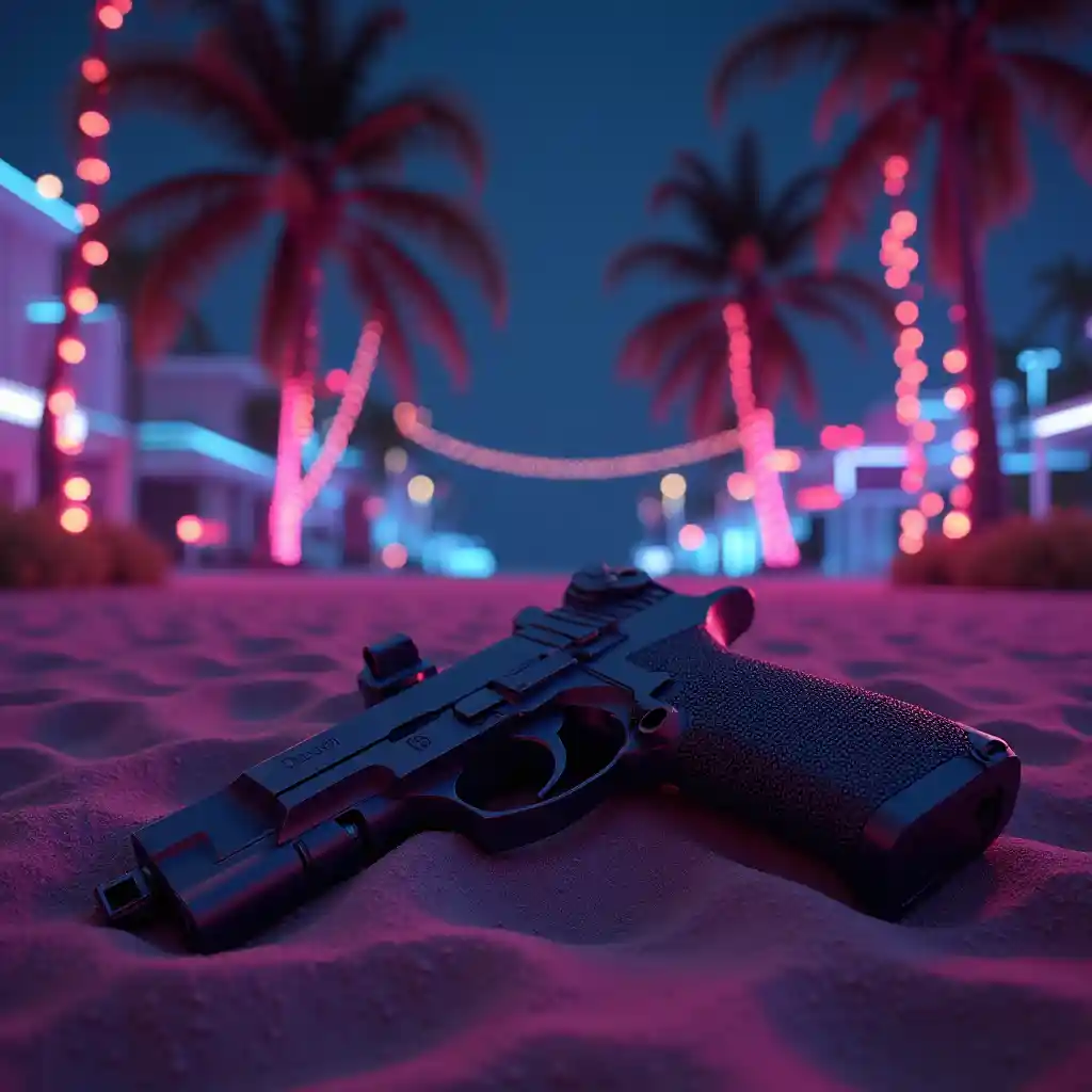슈퍼 리얼리티 네온 팔레트, 야간 하이 디테일 마이애미, 모래 속에 누워있는 권총, 야자수, 언리얼 엔진, 옥탄 렌더링, 시네마 조명, y2k, 밝은 색상, 슈퍼 리얼리티, 저각도, 16k, 8K 울트라 HD, 8K 텍스처, 영화, 에지 라이팅, 네온 팔레트, 색상 이론, 드라마, 볼륨 라이팅, 35mm, 초점, 언리얼 엔진, 하이 디테일, 옥탄 렌더링, 초고해상도.