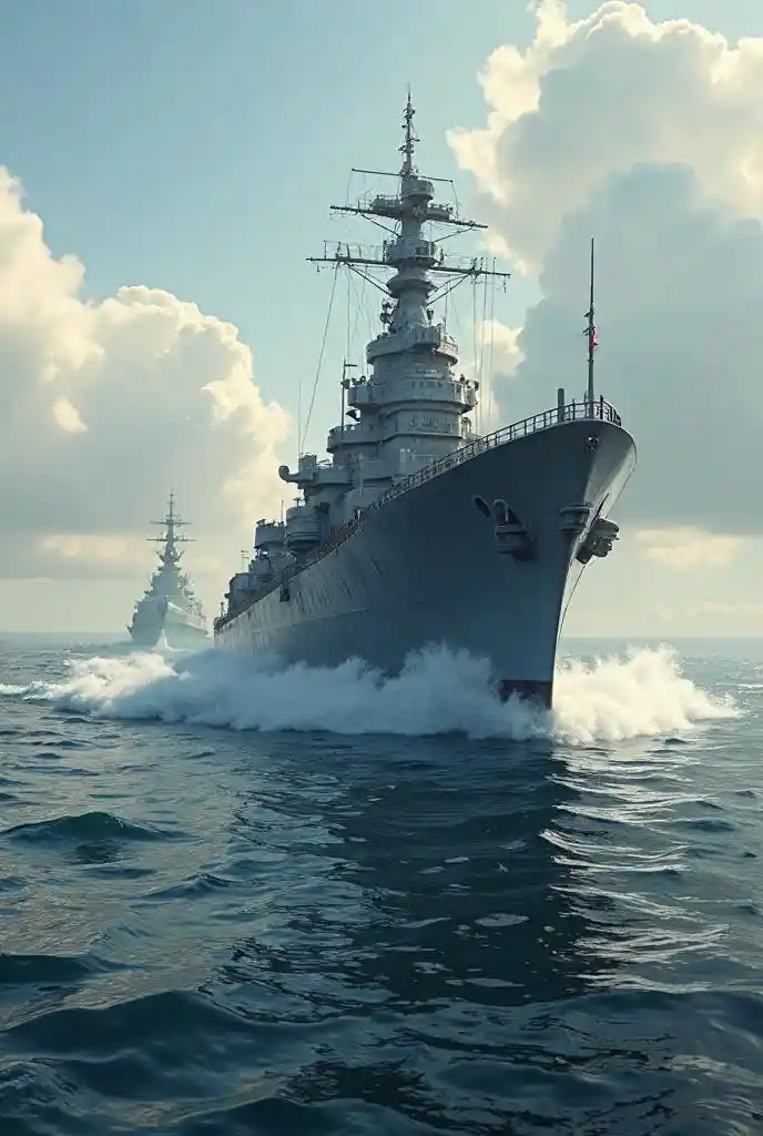 고도의 디테일한 전함, 바다 건너편, 거대한 선체가 햇빛에 빛나고, 거대한 바다 괴물이 헤엄치고 있고, 물 위에 잔물결이 일고, 하늘이 끝납니다.