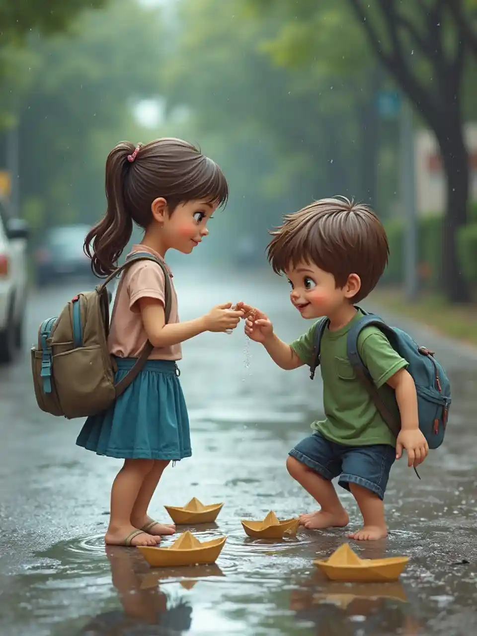 길가의 빗물 속에서 종이배를 타고 놀고 있는 미소녀와 소년, 둘 다 학교에서 학교 가방을 들고 왔다.