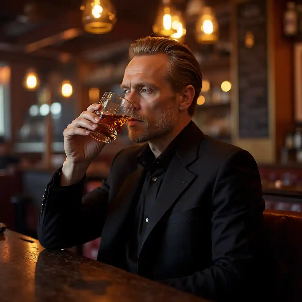 저속한 바에서 스카치 위스키를 마시는 Paul Betany는 자신의 행운을 비밀리에 기뻐합니다.