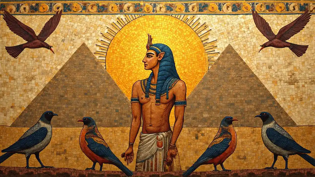 대칭형 파라오, 배경은 피라미드와 태양, 주변은 다양한 조류로 상감되어 있습니다.