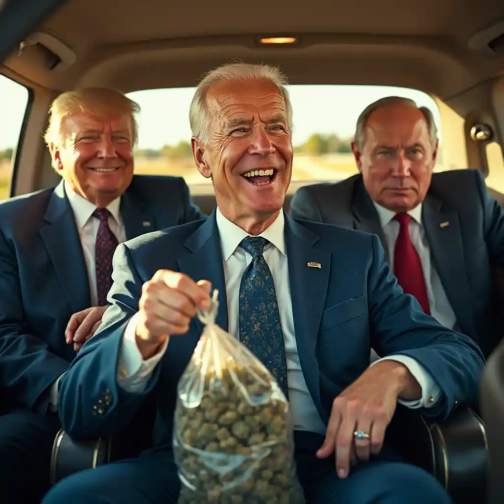 조 바이든은 도널드 트럼프와 블라디미르 푸틴에 둘러싸인 고급 자동차에 앉아 커다란 마리화나 가방을 들고 다채롭고 생생하며 유머러스한 분위기를 보여주고, 화창한 인테리어와 낙관적인 조명, 장난기 넘치는 표정과 캐주얼한 의상을 보여주는 포커스 피겨, 매우 디테일한 4K 해상도, 흥미로운 정치적 풍자를 포착합니다.