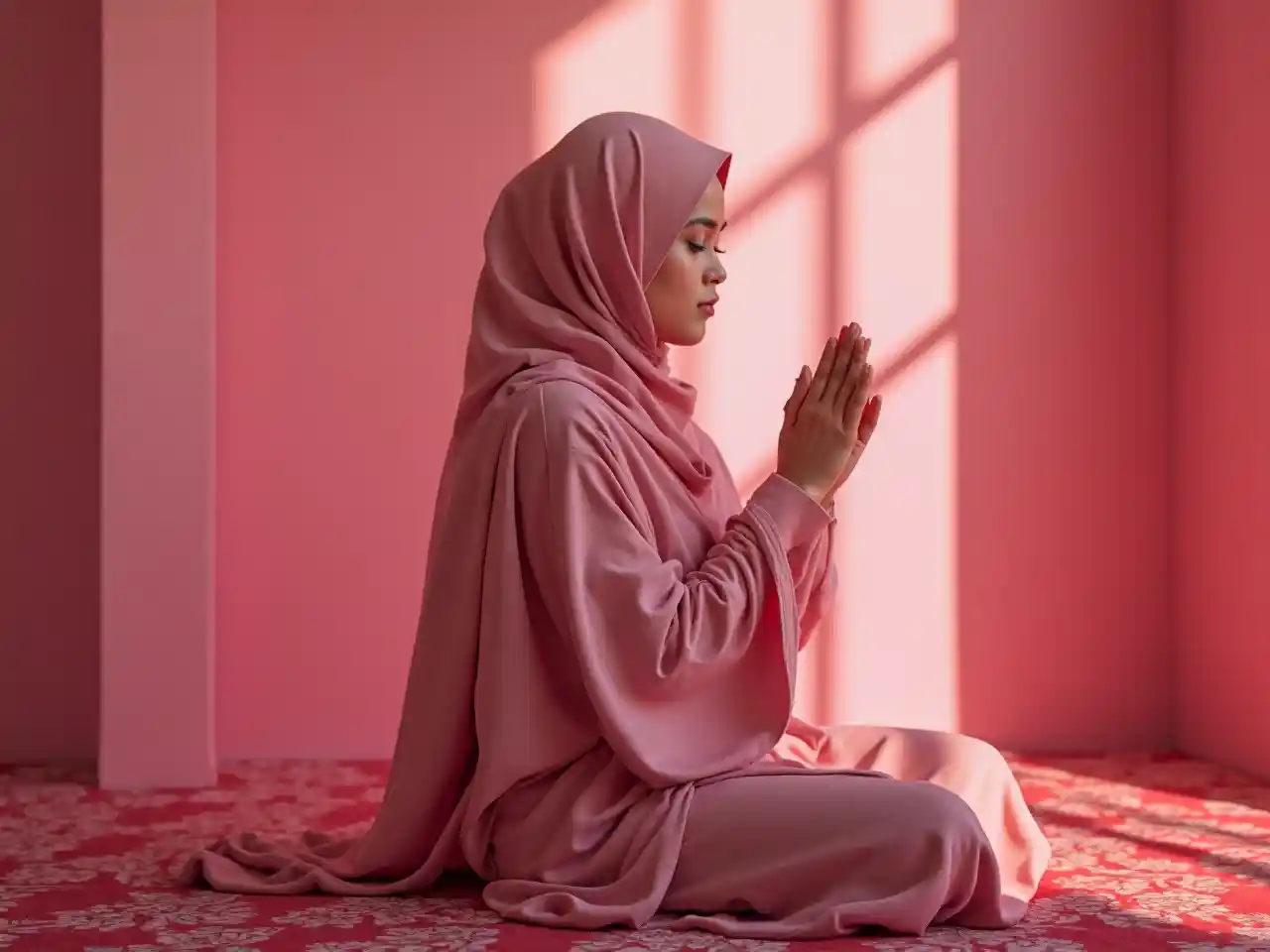 한 무슬림 여인이 분홍색 방에서 몸을 가리고 기도하고 있다.
