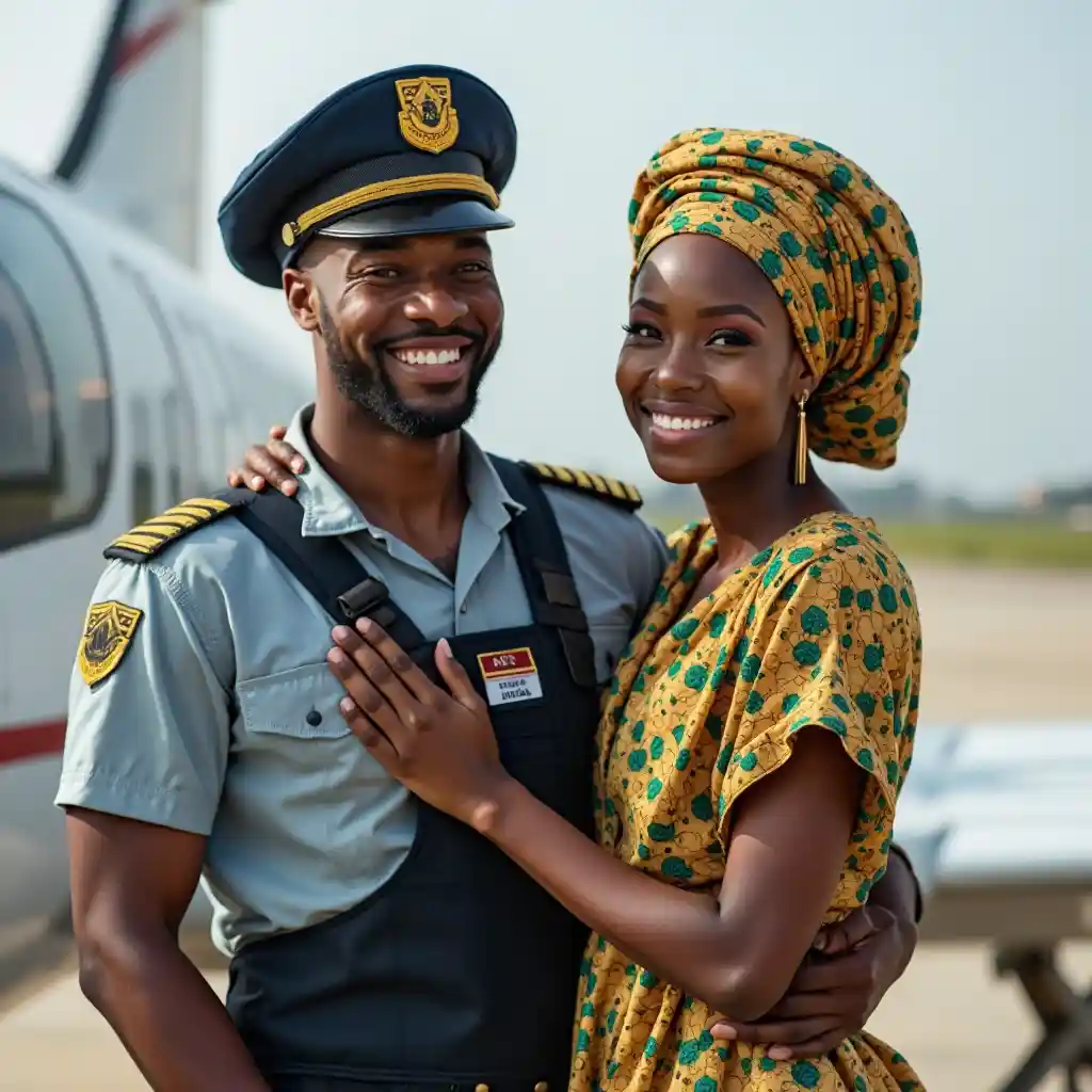 비행장에서 비행기 옆에 서 있는 연두색 갈색 핏의 아카라를 입은 아름다운 흑인 미녀 아내와 파일럿 제복을 입은 미소 짓고 미남인 아프리카 왕자의 이미지 생성