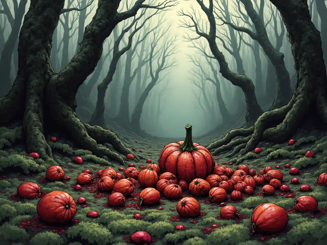 ( ( ( 클로즈업 16mm의 미소, 호박씨 ) ) , 검붉은 액체와 엉킨 과육에 흩어져 있으며, 일부는 싸여 낮은 소용돌이 안개 아래 이끼 숲 지면에서 휴식을 취합니다.주변의 나무들은 뒤틀리고 헐벗은 채 점차 음산하고 어두운 배경으로 변해갔다.:: 다크 판타지 호러 일러스트 :: 잉크와 그라파이트 스케치 스타일 :: ( 손으로 그린 모델링 ) 제럴드 브롬, 이안 밀러, 즈지스와프 베켄스키 :: ( ( ( 터프한 텍스쳐 ) ) ) : ( ( ( ( 변덕스러운 분위기 ) ) :: 음침하고 낡고 부자연스러운
