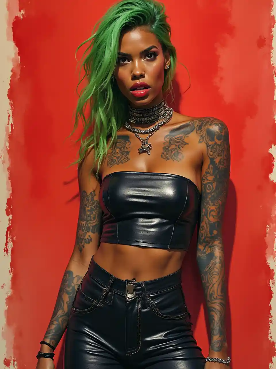 문신을 한 아프리카계 미국인 여성, 녹색 펑크 헤어, 가죽 튜브 탑, 가죽 타이트한 바지, 대담한 시선, 촉촉하고 반짝이는 피부, 검은 수채화 붓놀림의 빨간 바닥