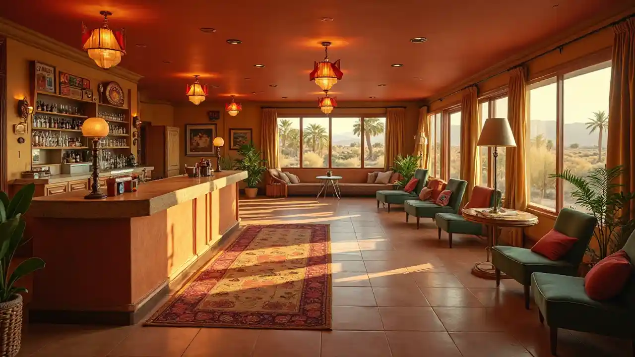 레트로 호텔 로비, 생동감 넘치는 1970년대 미학, 봉제 벨벳 가구, 세련된 바 공간, 향수를 불러일으키는 레트로 조명, 따뜻하고 매력적인 분위기, 햇볕이 잘 드는 사막 배경, 디테일의 레트로 장식, 고화질, 슈퍼 디테일, 영화 같은 톤, 편안하고 향수를 불러일으키는 분위기, 풍부한 대지 톤과 깊은 색상이 과거 시대의 매력을 포착합니다.