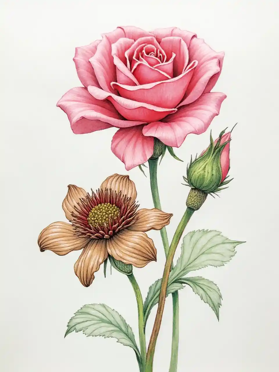 죽어가는 갈색 꽃 옆에 활기찬 분홍색 장미의 세밀한 색칠 연필 그림.