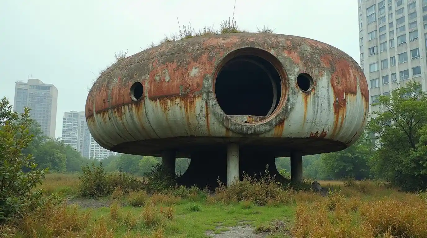 루즈 탐험 모험이 이상한 버려진 잡초가 무성한 조경 건물을 방문하십시오.바우하우스 양식의 낡고 버려진 녹슨 콘크리트 야만주의 건축물의 사진.이 건물은 외계인 같은 구조를 가지고 있으며 크고 둥근 창문이 있습니다.배경은 높고 현대적인 건물을 가진 도시를 포함합니다.이 사진은 초현실적이고 몽환적인 품질을 가지고 있습니다.