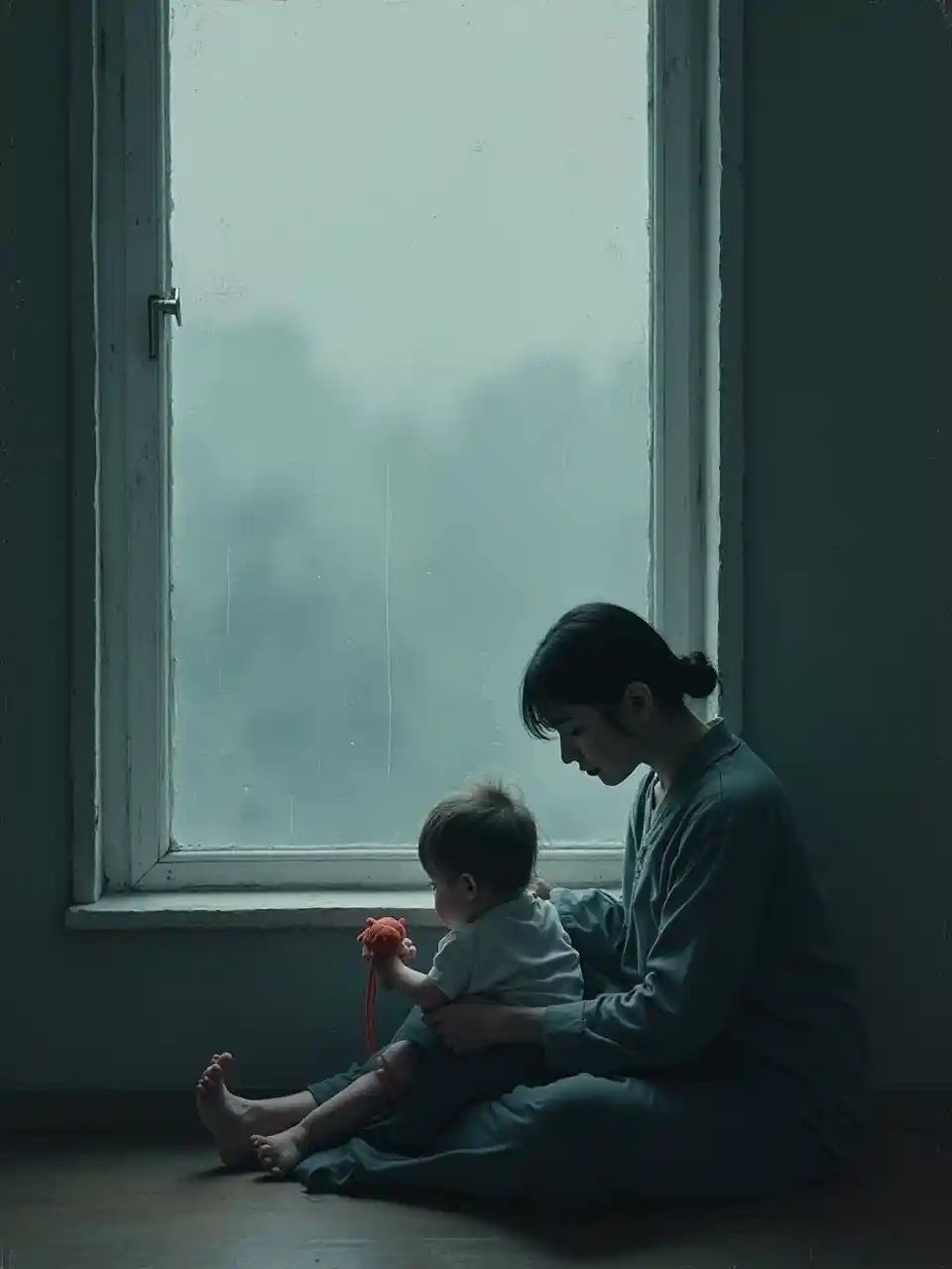 rubylyn슬픔 – "회색 몬순" “창가에 홀로 앉아 아이의 장난감을 들고 무거운 그리움으로 가득 찬 얼굴을 한 엄마. 팔레트: 차콜 그레이, 미스트 블루, 페이드 블루 그린, 레인 화이트. 기분 : 우울, 느림, 깊은 인간성