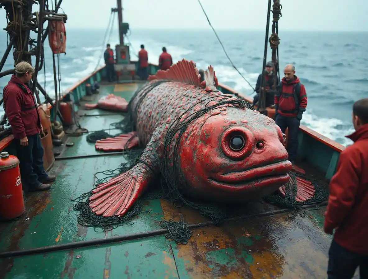 원양 어선의 갑판에는 붉은 중국 수도꼭지를 가진 물고기 괴물이 어망을 감고 갑판에 누워 있었고 어선의 선원들은 경계하기 위해 양쪽에 서 있었습니다.