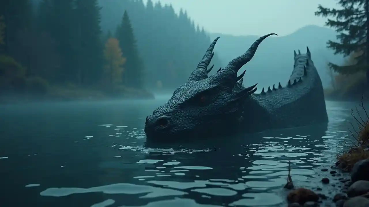 러시아 호수의 외딴 깊은 물에 사는 용의 머리를 가진 뱀처럼 보이는 어둡고 신비한 호수 괴물의 사진을 만드십시오.