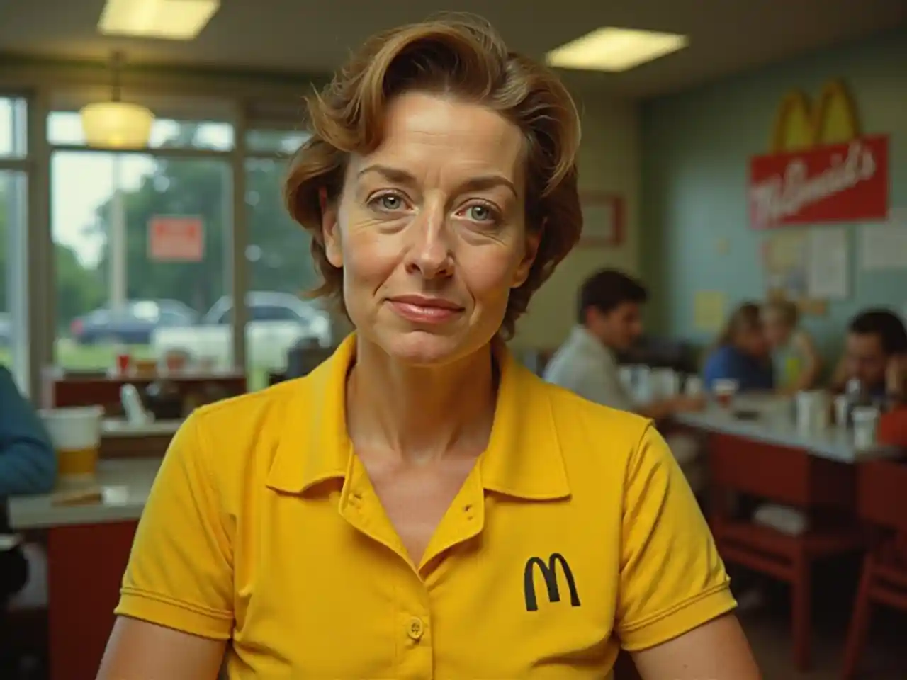 시모네 드 보부아르 맥도날드 직원 역.온몸에 땀을 흘리며 노란 폴로 셔츠