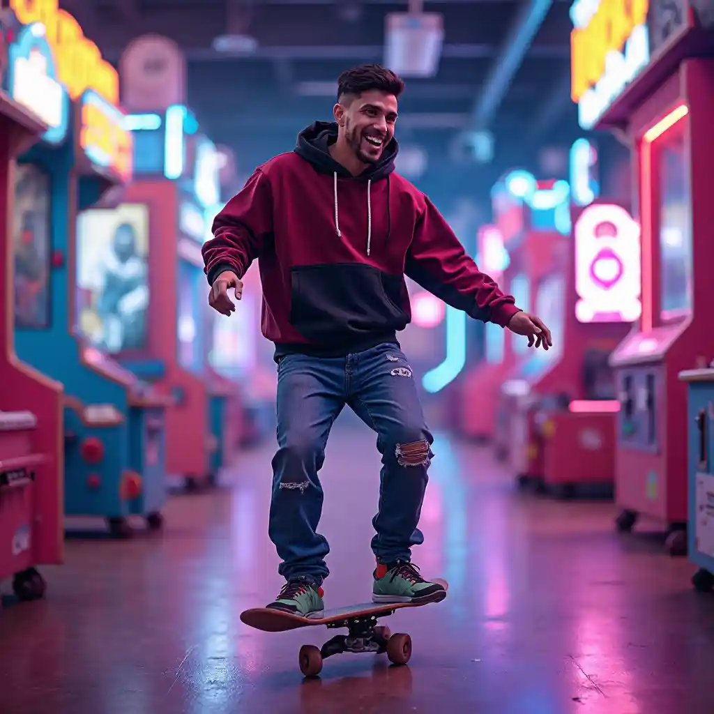 스케이트보드가 미래형 오락실을 가로지르는 가운데 대담한 후드티를 입고 반짝이는 20대 중동 남성.홀로그램 게임과 네온 사인이 그를 감싸고 그의 역동적인 기술과 자신감 넘치는 미소는 활기찬 하이테크 환경에서 젊고 반항적인 매력을 발산합니다.