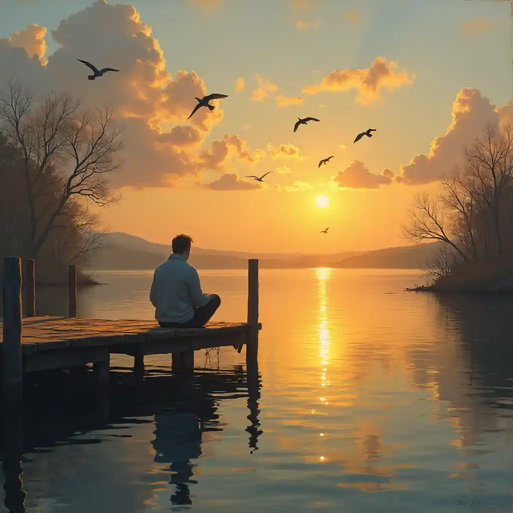 해질녘에 고요한 호수의 소박한 부두에 조용히 앉아 있는 한 남자의 형이상학적 그림, 하늘에 튀는 따스한 황금빛 노란색, 고요한 분위기, 머리 위로 우아하게 치솟는 새들, 물에 비친 자연스러운 모습, 미술 스타일, 매우 세심하고 평화와 내성의 본질을 포착하는 조화로운 팔레트.