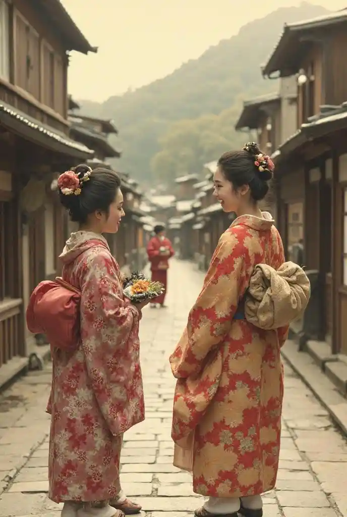 복고 황갈색, 다이쇼 시대의 일본, 강렬한 색감의 기모노와 도시적인 모습