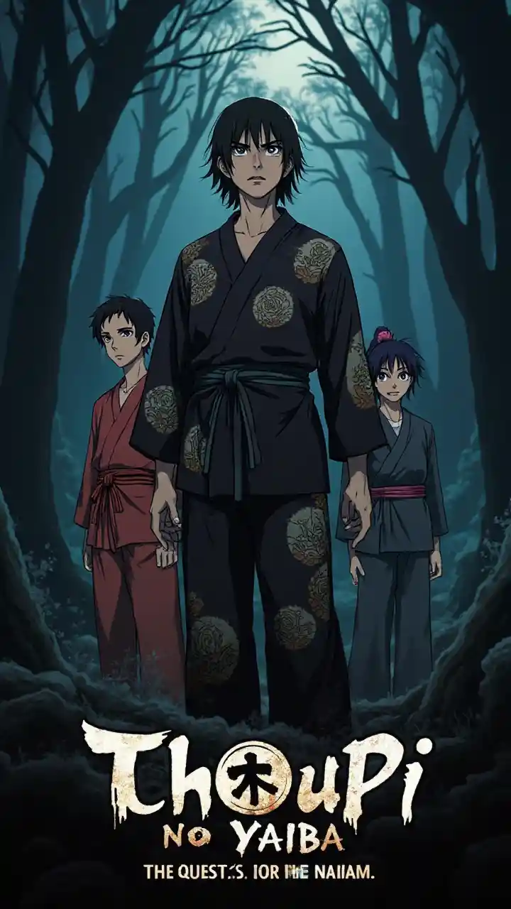 어둡고 진지한 영화 포스터, 스타일의 데몬슬레이어.영웅으로서 Tchoupi는 확고한 자세로 일본을 모티브로 한 성스러운 잠옷을 입고 있습니다.옆에는 제니츠, 이노스케, 츄피판 네즈코가 데빌 슬레이어를 모티브로 한 진지한 표정과 복장을 하고 있다.배경의 불안한 일본 숲, 악마의 그림자, 극적인 조명.제목: Tchoupi No Yaiba: The Quest for the Sacred Pajamas, in stylized anime style letters.