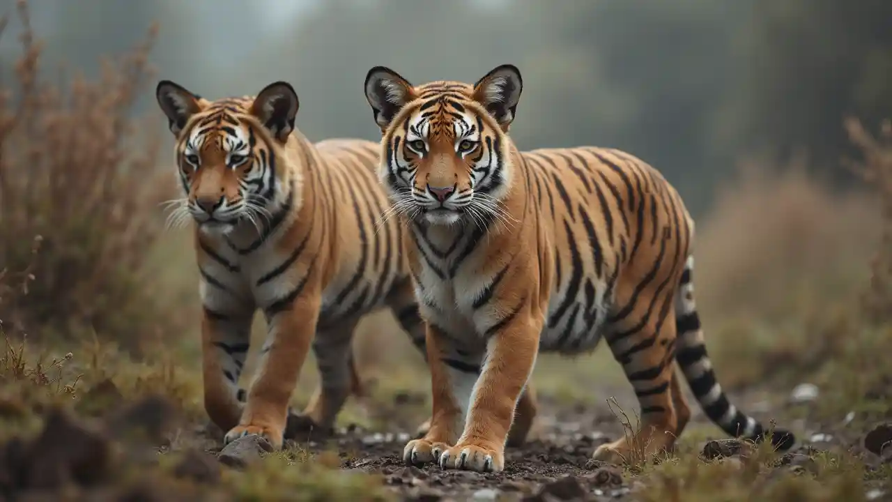 사람들에게 둘러싸인 호랑이와 함께 찍은 19세기 사진