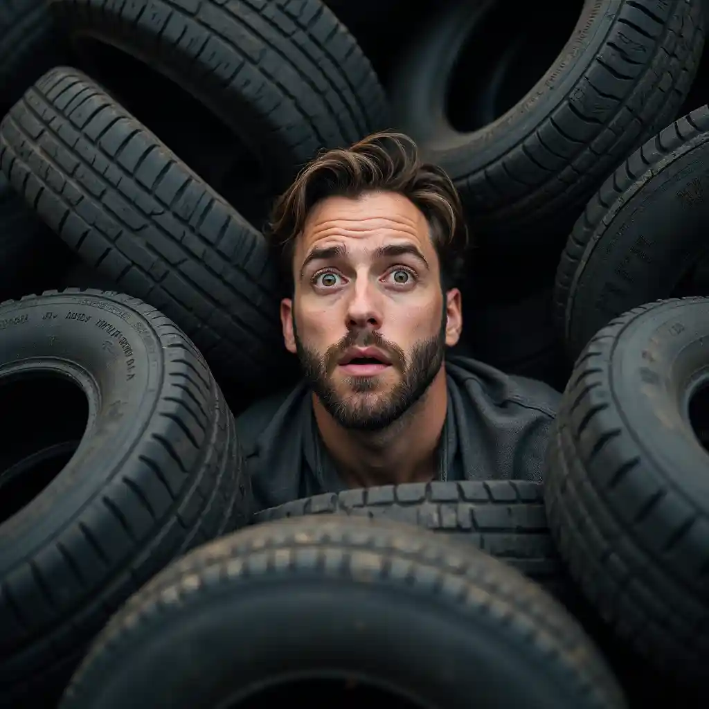 타이어와 타이어 무더기로 둘러싸인 남자, 카메라를 올려다보며 놀란 남자, 인벤토리 사진, 컨셉, 얼굴만