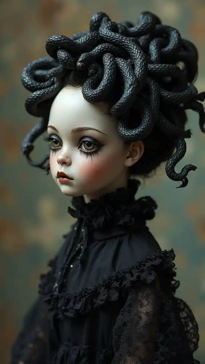 Quay Brothers 스타일, 빅토리아 시대 도자기 인형 머리, 블랙 맘바 뱀으로 만든 머리, 복잡한 블랙 레이스, 파스텔 컬러, 고딕 호러, 하이 디테일