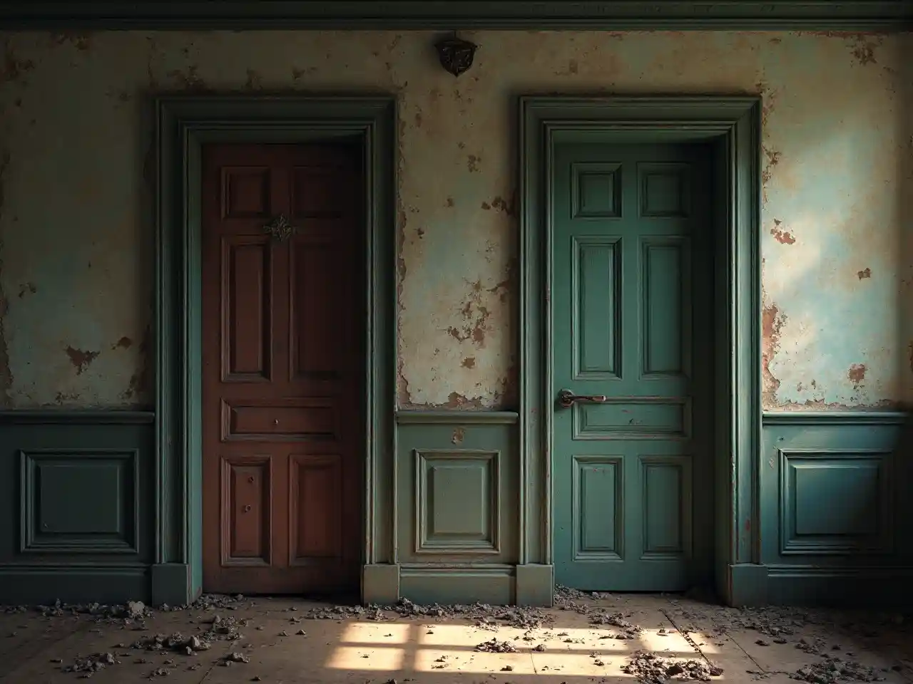 낡아빠진 빅토리아 시대 저택에 서로 다른 두 문을 만드는 이미지