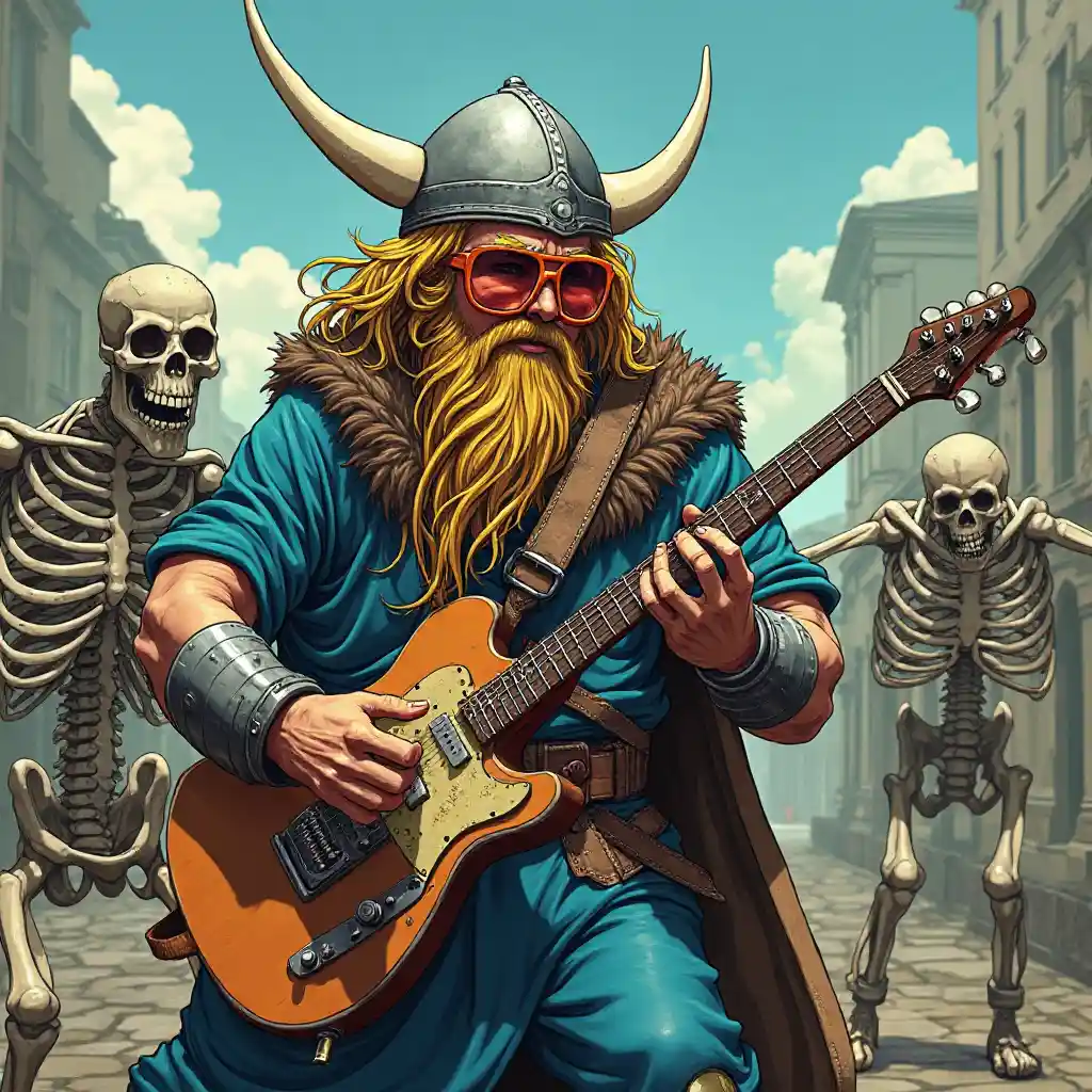 바이킹, 긴 금발 수염, 오렌지색 톤, 파란색 복장, 웰딩 키타르, 스켈레톤과 충돌