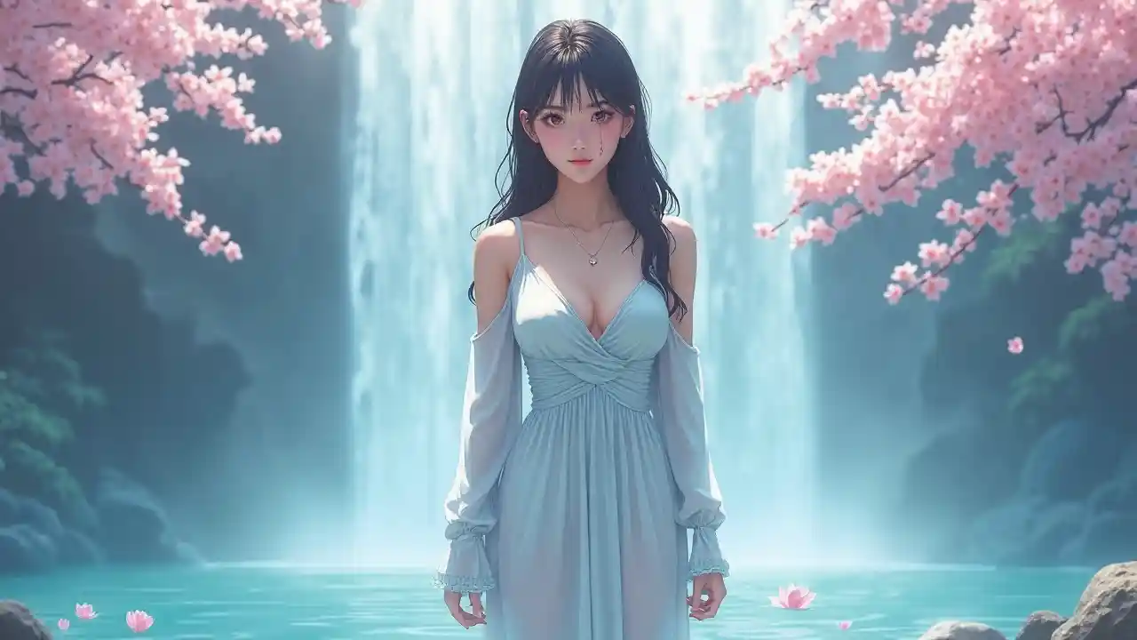 전면 렌즈 시점으로 촬영한 디지털 일러스트는 긴 네크라인이 처진 노골적인 하늘색 긴팔 드레스를 입고 물 속에 서 있는 여성의 가느다란 체격을 보여준다.20대로 보이는 여성은 영상 한가운데에 서서 진지한 표정으로 관객들을 마주하고 있다.그녀는 뒤로 늘어진 긴 검은 머리를 하고 있으며 그녀의 눈은 관객을 똑바로 바라보고 있습니다.슬림한 몸매에 몸에 꼭 맞는 투명한 흰색 원피스를 입고 있으며,그녀의 헐벗은 어깨와 허벅지를 드러내다.배경은 폭포와 벚나무로 이루어진 조용하고 공허한 풍경이 특징이며, 이미지는 왼쪽 상단에 워터마크가 있는 부드럽고 몽환적인 품질을 가지고 있습니다.