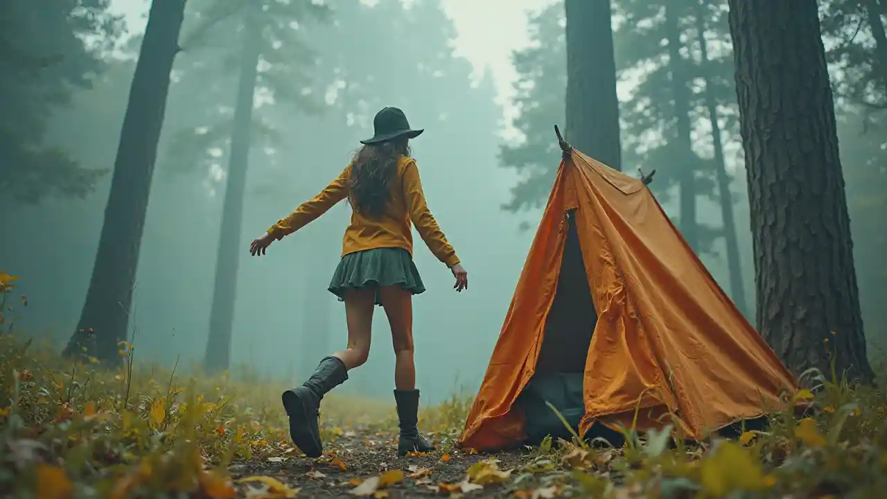 긴 팔과 긴 다리를 가진 여성 캠핑 기발한