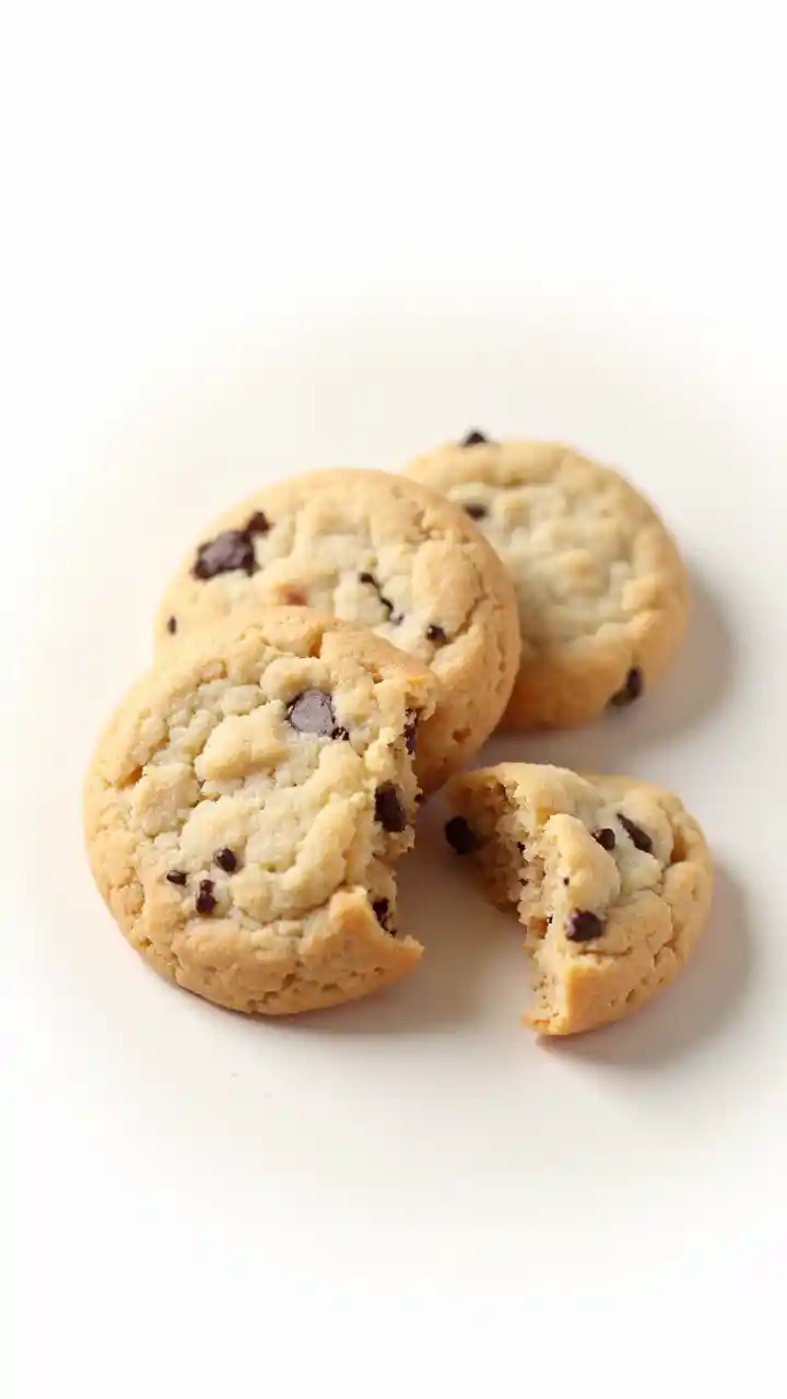 흰 바탕에 통밀 비스킷 세 조각, 쿠키 표면에 균열 없음, 속 없음, 전채, 가벼움, 바삭함, 곁눈질, 누워있는 두 조각의 쿠키, 한 조각은 옆으로 부수고 초콜릿과 스프링클러가 섞이지 않음, 사실주의, 백라이트