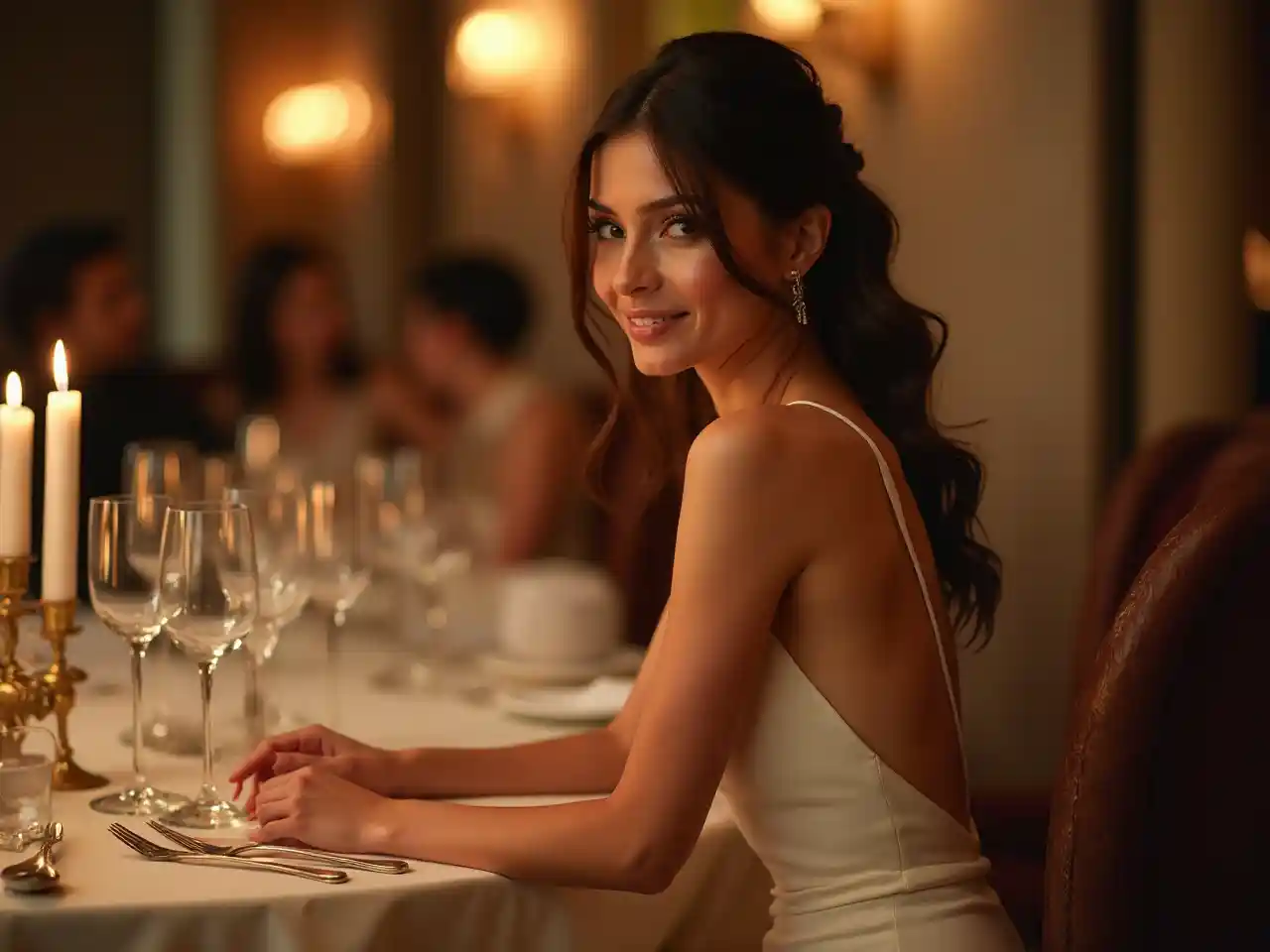 우아한 식탁에 앉기 위해 낮은 네크라인으로 곡선을 그리며 흰색 드레스를 껴안고 있는 여성을 상상해 보십시오.드레스는 그녀의 몸매를 강조하고 부드러운 촛불이 따뜻한 빛을 비추며 매력과 우아함을 발산합니다.
