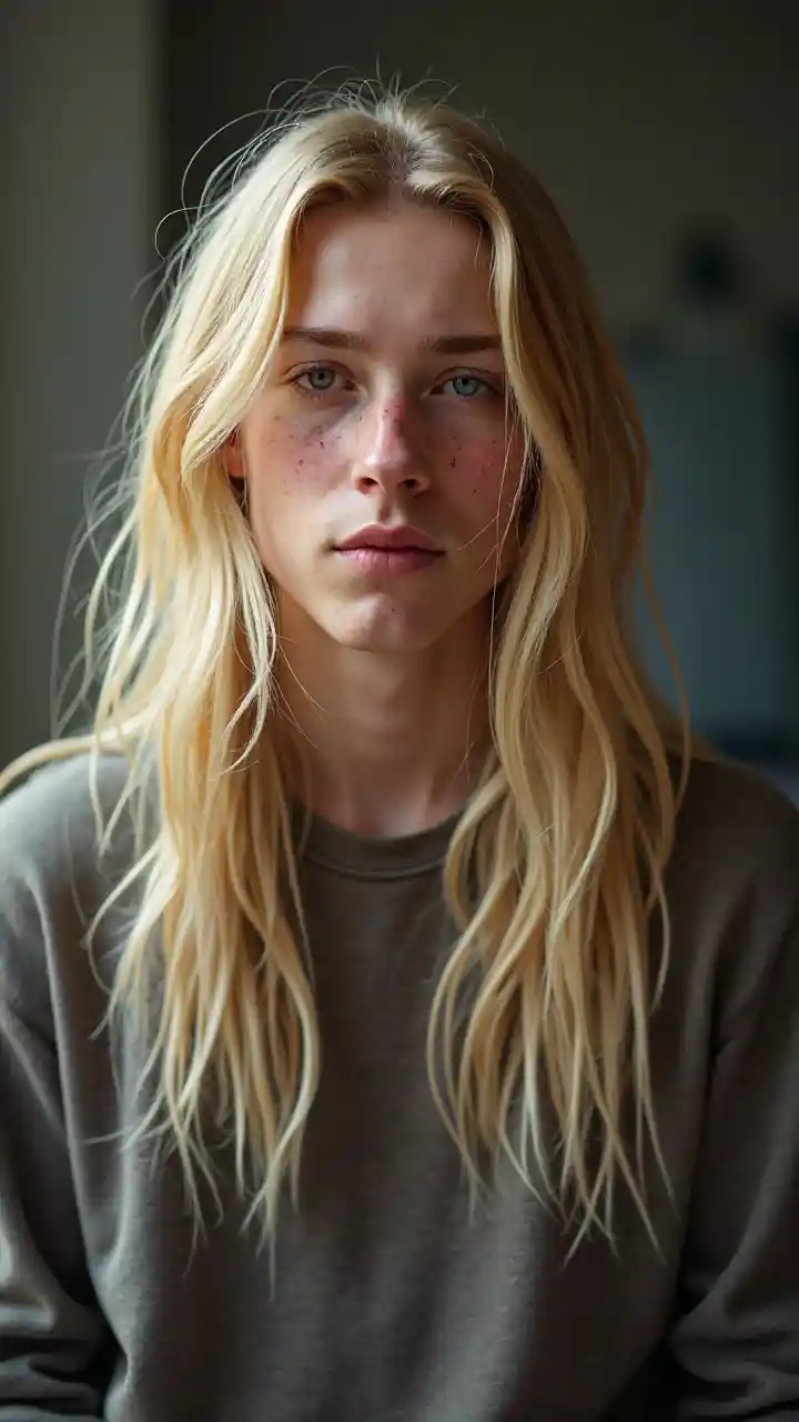 창백한 얼굴의 젊은 남자, 매우 긴 금발 흩어진 머리카락