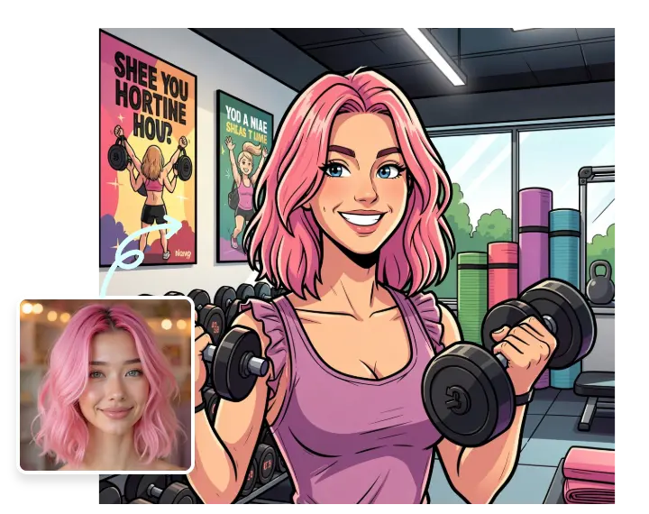 फिटनेस कॉमिक फिल्टर निवडा. एआय आपोआप तुम्हाला जिमच्या सीनमध्ये ठेवते आणि डंबल्स आणि कॉमिक अॅक्शन इफेक्ट्स जोडते.