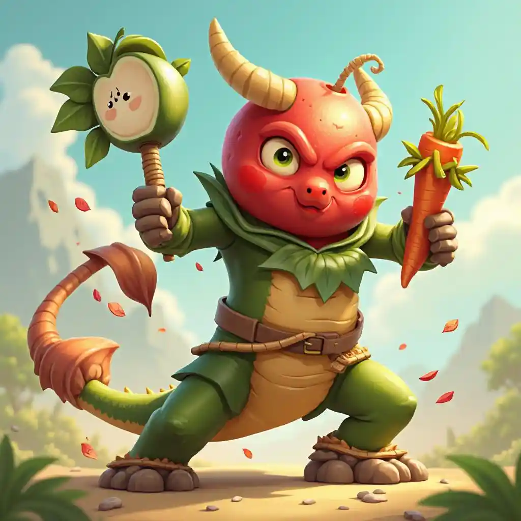 Maverickथ्रीडी गेम, फॅन्टीसी कार्टून, फॅन्टीसी हिरो, गाजरने सशस्त्र आणि नटशेलने बचाव करतो, ड्रॅगनच्या विरुद्ध लढतो, त्याचे शरीर सफरचंद बनलेले आहे आणि त्याचे डोके पाण्यात आहे, चमक,