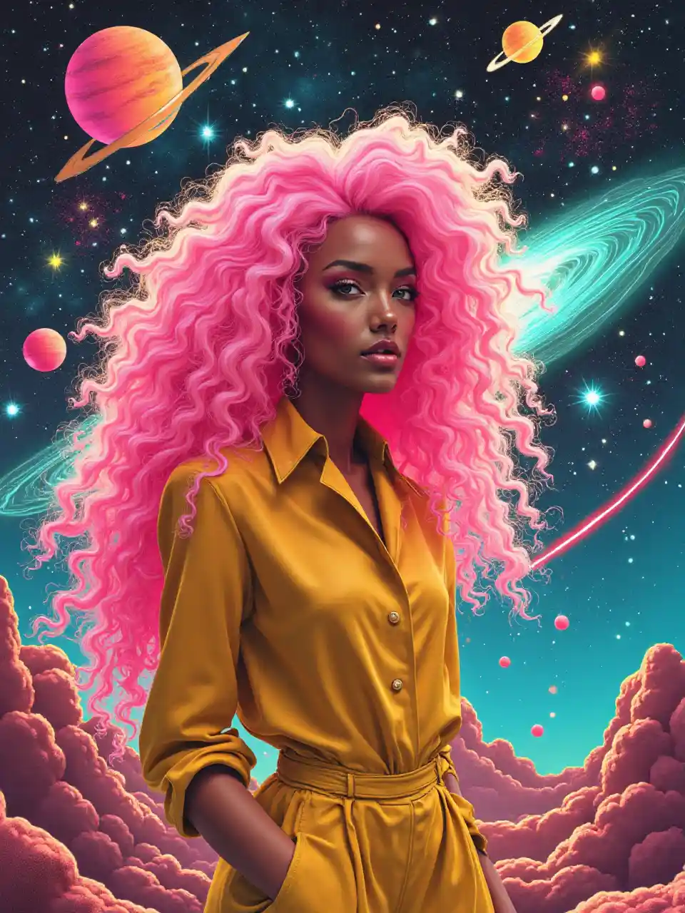 * "एक विलक्षण, दीर्घ, गुळगुळीत गुलाबी केस असलेली एक आकृती जी एक वैश्विक लाट म्हणून वाहते. या मूर्तीला मोहक, आधुनिक कपडे आहेत. त्यात रंगीत वातावरण आहे. या पार्श्वभूमीवर चमकदार, मनोविकृत ऊर्जा आहे. या दृश्यामध्ये चमकदार भूमितीय घटक आहेत, जसे की फिरणारे आकाशीय रिंग आणि कोनातले रेट्रो डिझाइन, तर रंग पॅलेट निर्दोषपणे बोल्ड आणि संतत आहे, निऑन ब्राइट्स आणि कॉस्मिक कॉन्ट्रास्टवर भर दिला आहे. १९७० च्या दशकातील विज्ञान कल्पनारम्य, आधुनिक वैश्विक सर्रॅलिझम आणि मनोविकृत प्रकाश यांचे एक विलक्षण मिश्रण आहे. *