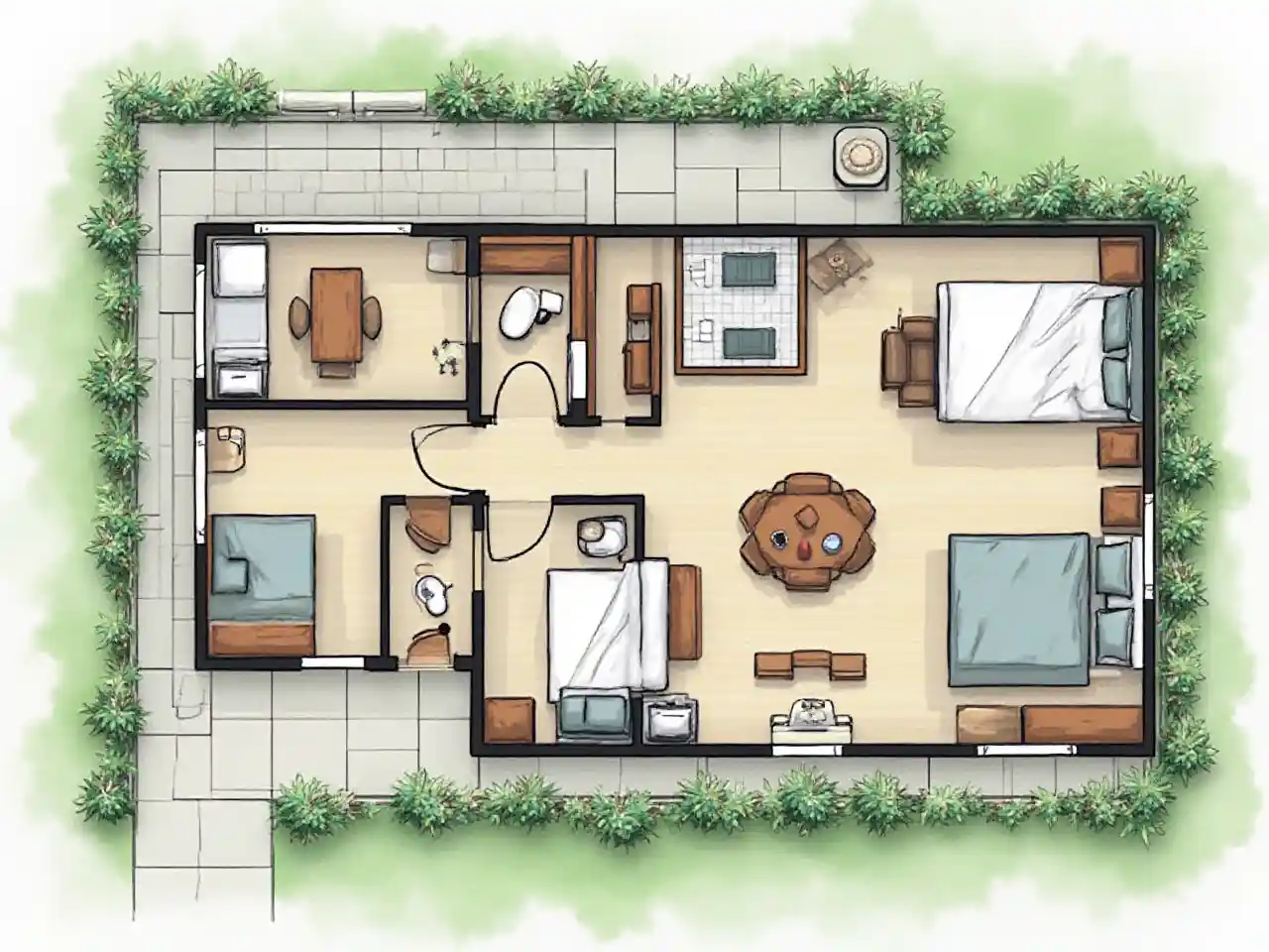 आधुनिक कॉटेजसाठी मजला तयार करा ज्यात 3 बेडरूम आहेत, 1 स्नानगृह आणि एक ओपन प्लॅन किचन, जेवणाचे आणि लिव्हिंग एरिया आहे. संपूर्ण प्लॅन ८० चौरस मीटरपेक्षा जास्त नसावा. मुख्य बेडरूमची क्षेत्रफळ २० चौरस मीटर असेल तर दुसरी बेडरूमची क्षेत्रफळ १२ चौरस मीटर असेल तर शेवटची बेडरूमची क्षेत्रफळ १६ चौरस मीटर असेल. बाथरूम ९ चौरस मीटर असेल. बेडरूम आणि बाथरूमला इतर खोल्यांपासून एक कॉरिडोरने वेगळे केले जाईल.
