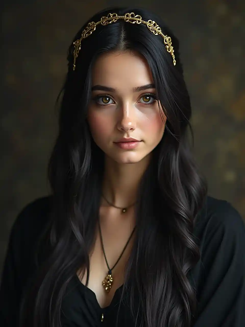 सुंदर राणी, काळे लांब सरळ केस, काळे फॅब्रिक, डोक्यातील वस्तू आणि तपकिरी डोळे
