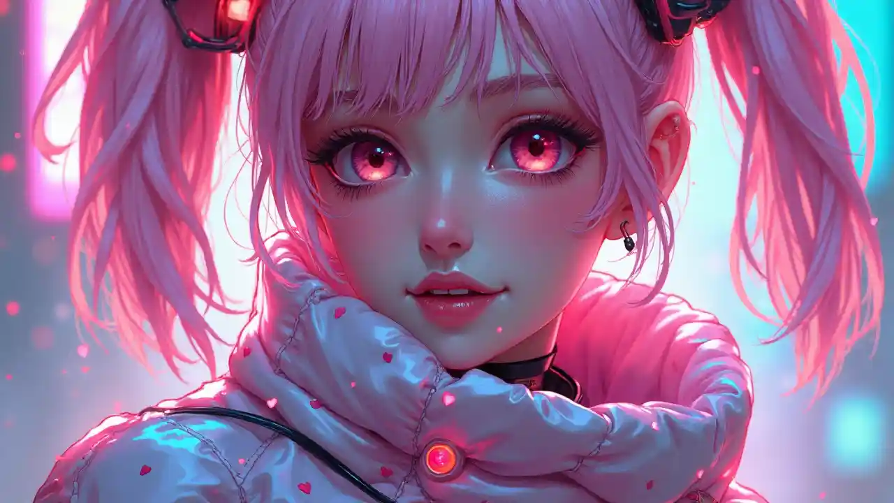 Detailed portrait of cute smiling girl, cyberpunk futuristic neon, pastel pink pigtails, reflective puffy coat, decorated with hearts, by ismail inceoglu dragan bibin hans thoma greg rutkowski alexandros pyromallis nekro rene maritte illustrated, perfect face, fine details hijab girl in futuristic robotic suit detailed ana de armas portrait neon operator girl cyberpunk futuristic neon reflective puffy coat, decorated with traditional japanese ornaments by ismail inceoglu dragan bibin hans thoma greg rutkowski alexandros pyromallis nekro rene margitte illustrated perfect face, fine details, realistic shaded, fine - face, pretty face, tongue out