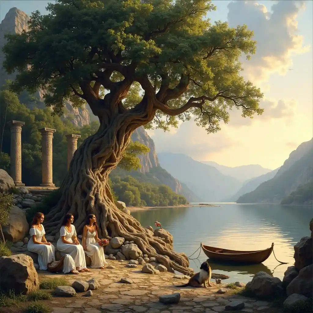 एका रोमन इमारतीच्या खंडहरात एक विशाल , गुंतागुंतीचे , प्राचीन आणि समृद्ध झाड आहे . इमारतीतील दगड आणि खडक जमिनीवर विखुरलेले आहेत . डाव्या बाजूला घनदाट जंगल आणि दूर डोंगर असलेले विशाल सरोवर आहे . एक बोट किनाऱ्यावर उतरले . पांढऱ्या कपड्यांमध्ये अनेक रोमन स्त्रिया कुत्रा सोबत सरोवराच्या काठावर बसल्या आहेत . धुके . सूर्यास्त