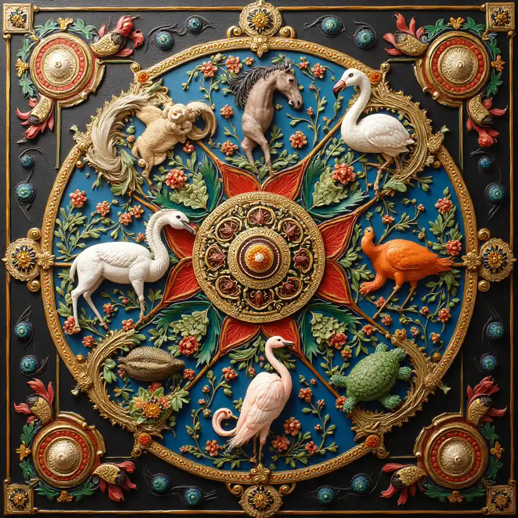 ८ विभाग असलेले मंडला चित्र, घोडा, बैल, गरुड, फ्लेमिंगो, सिकडा, ड्रॅगन फ्लाई, बेड, कासव, क्रोनोफोटोग्राफीच्या शैलीत, तेजस्वी रंग, सोने