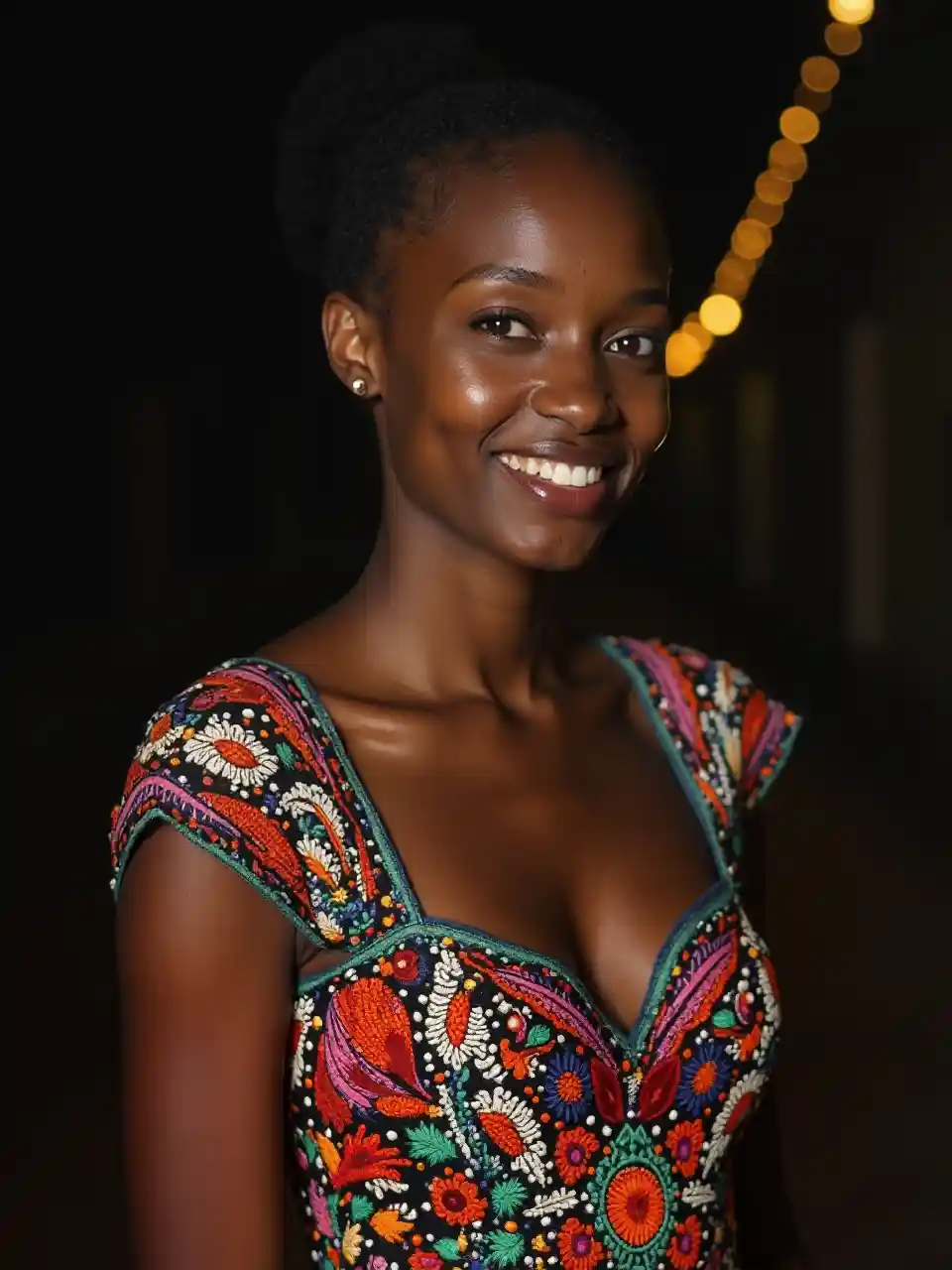 OliverEen mooie, kale, zwarte Afrikaanse vrouw met sproeten, die een kleurrijke, levendige, gedetailleerde geborduurde jurk draagt, midden-full shot,'s nachts
