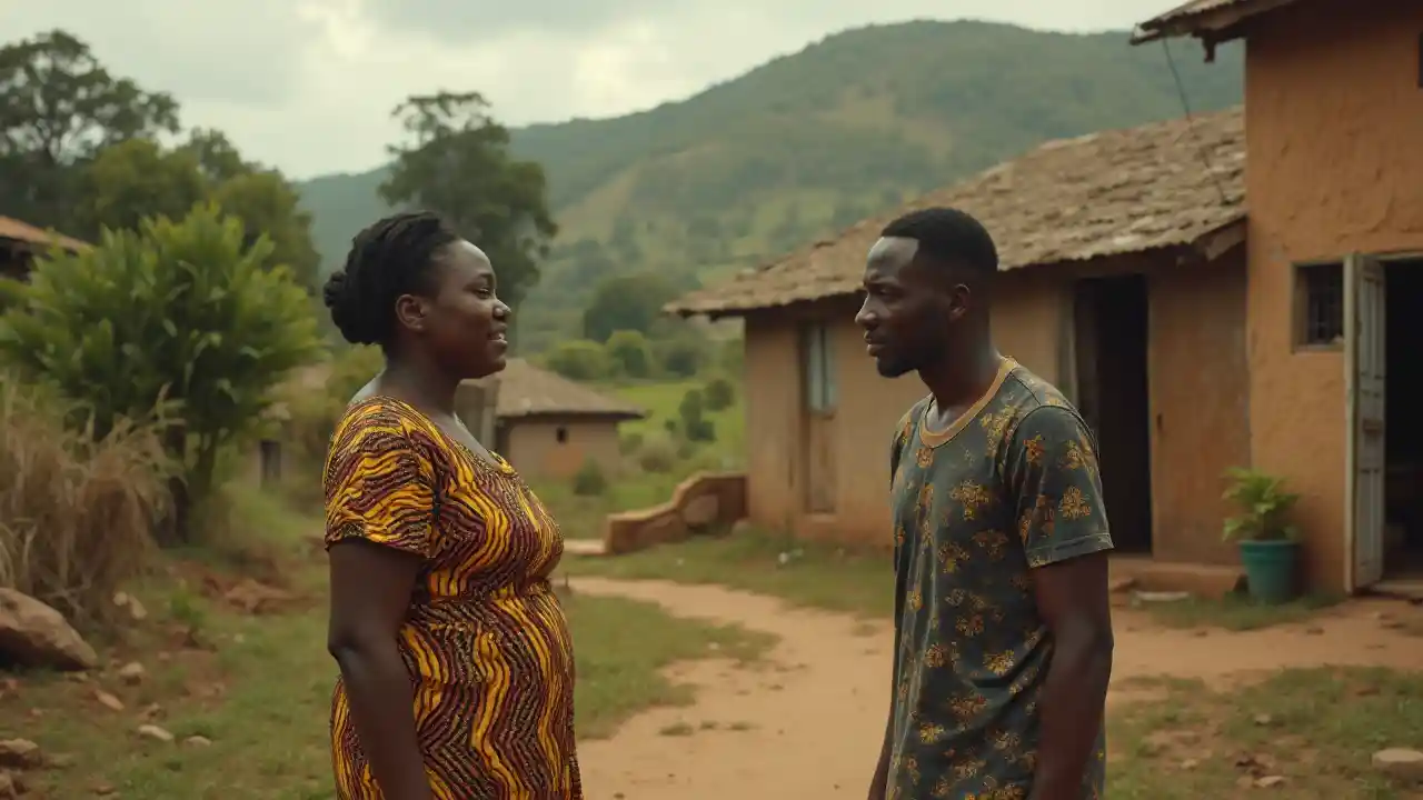 Een knappe Afrikaanse donkere man van 30 staat in zijn prachtige huis, met een minachtend gezicht. Hij zag er bitter uit, hij droeg Igbo-stof, de scène liet hem schreeuwen naar een jonge Afrikaanse donkere vrouw van 30 die gekreukeld Igbo-stof droeg en er niet op uitzag, de vrouw die huilt