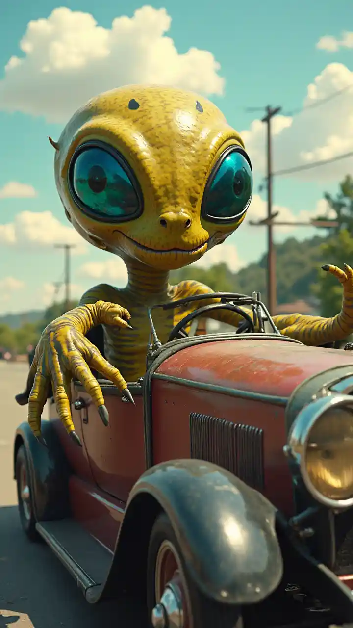 Domme alien, groot oval hoofd, saffier ogen met tijger klauwen armen rijden in een Model T Cabrio