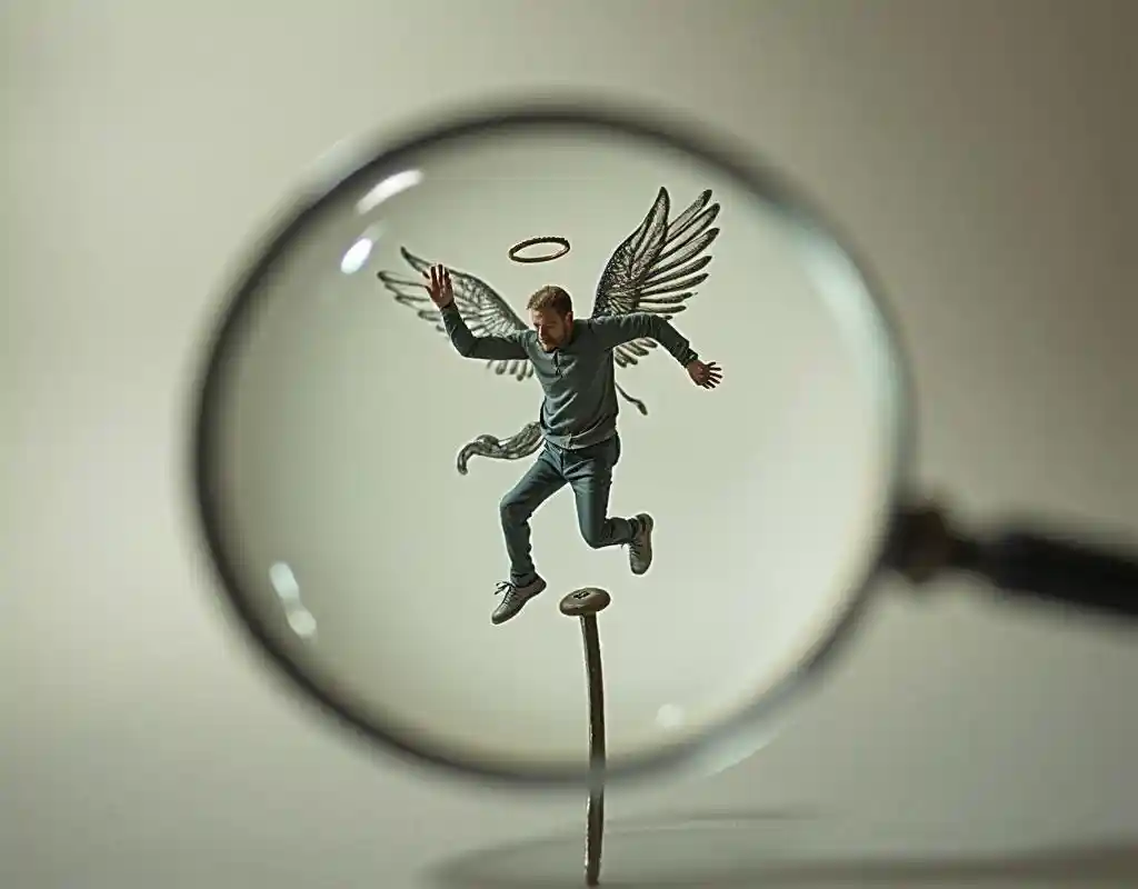 Een vergrootglas toont een man met een halo en engelenvleugels die slecht dansen op het hoofd van de naald, kleine man, vergroot naald hoofd, dat slecht danst met schop en arm
